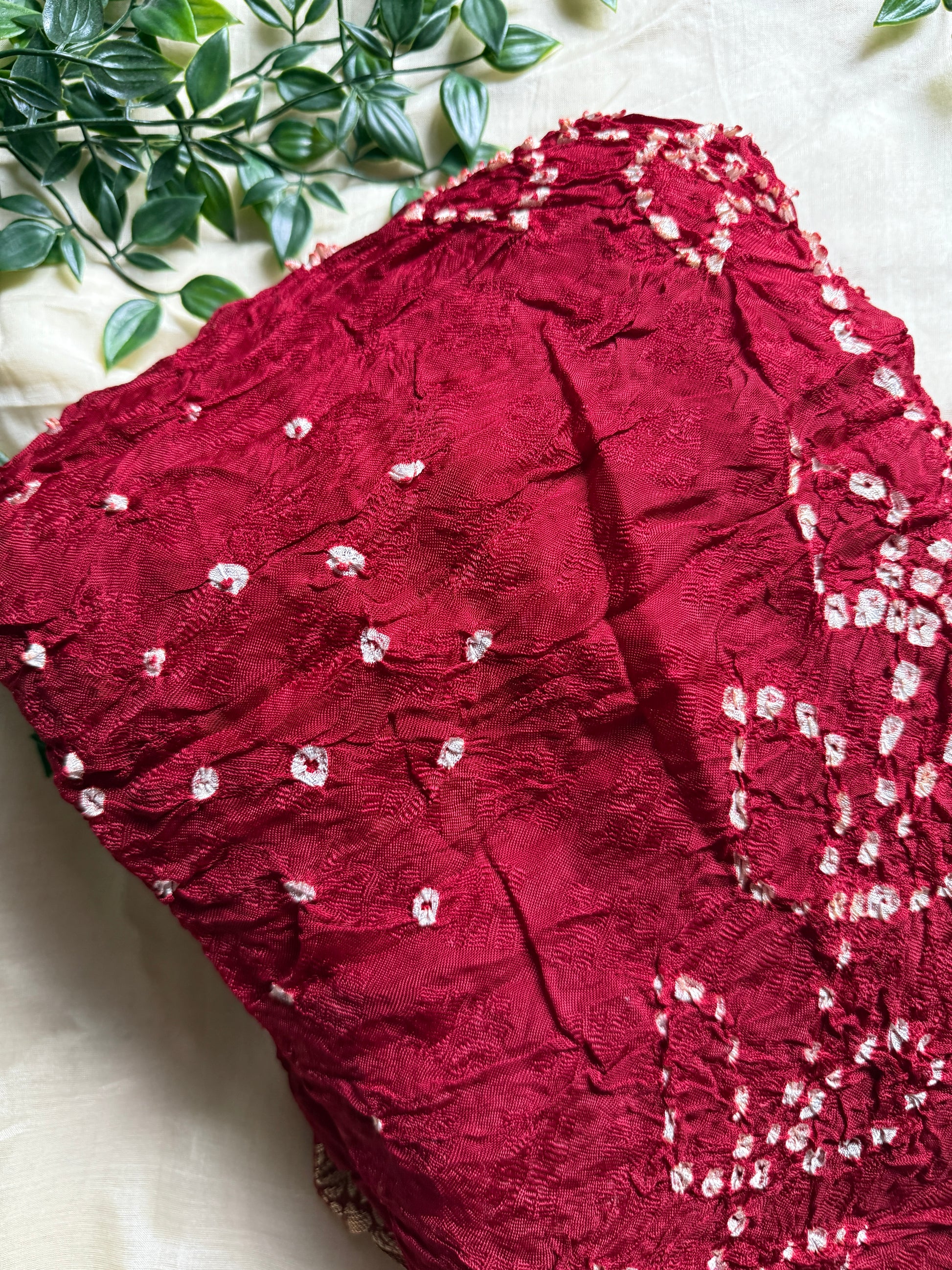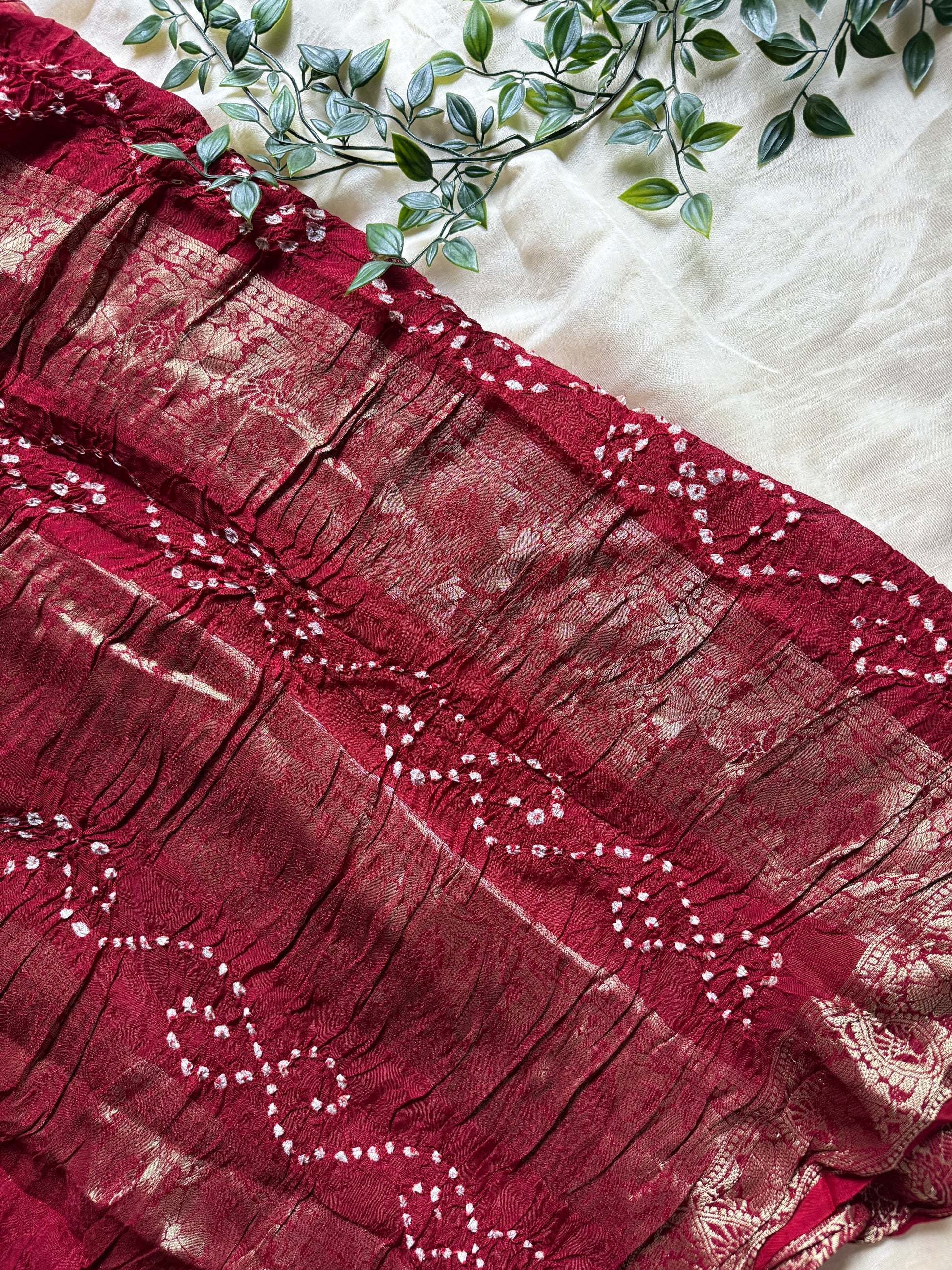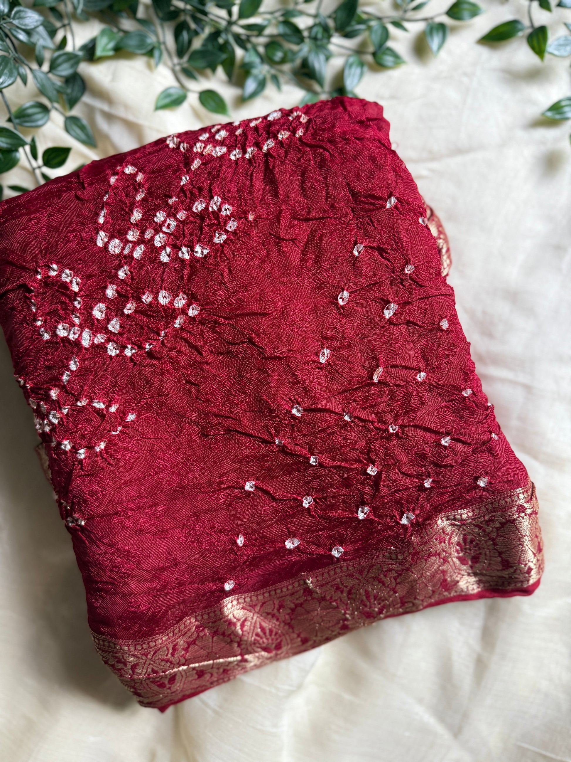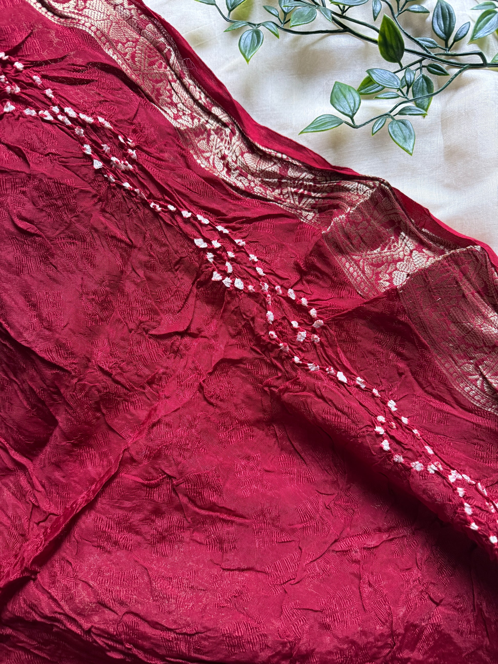 Hand knotted Jaquart Silk Bandhini Sari in Bindhi Maroon.