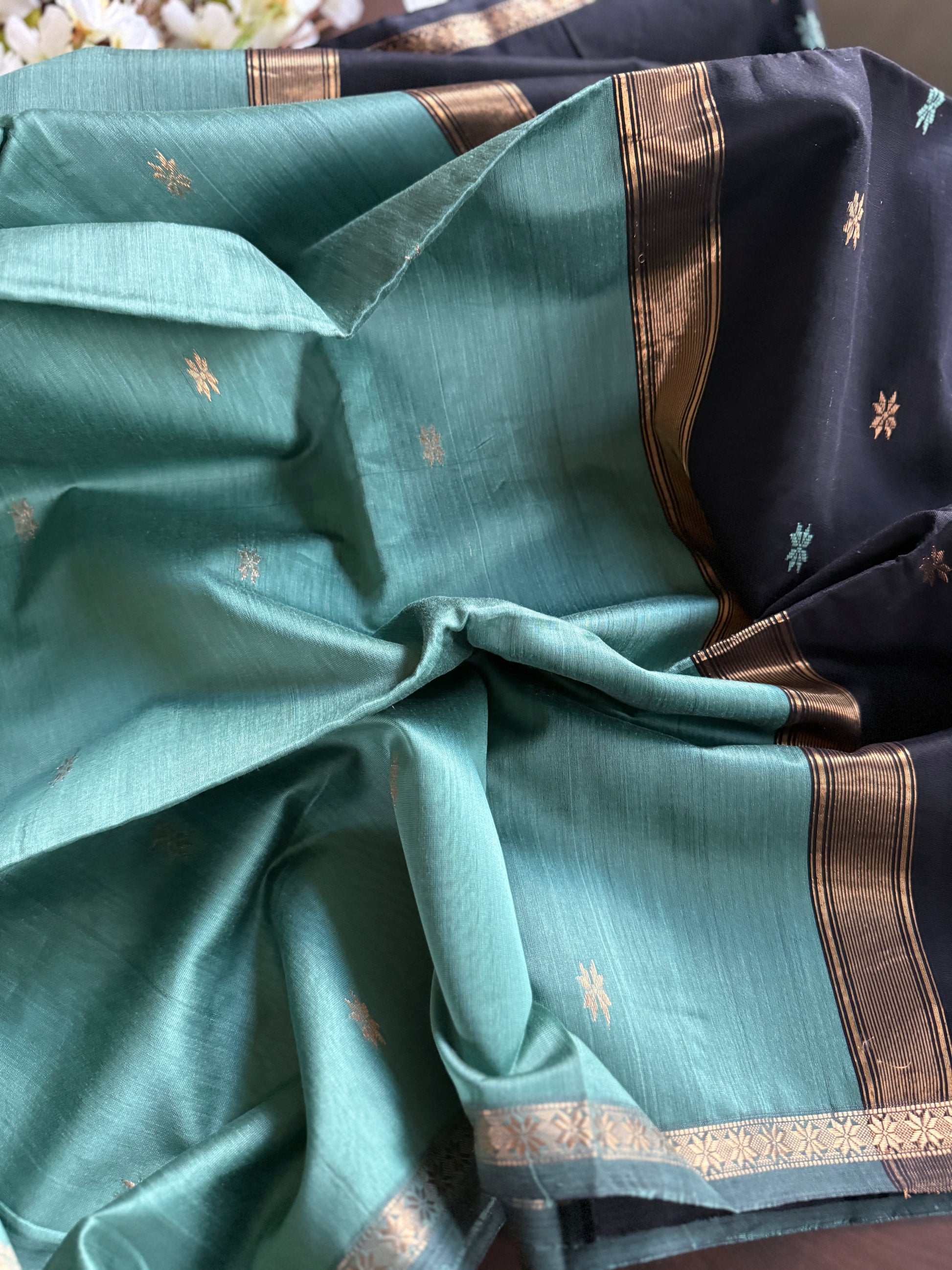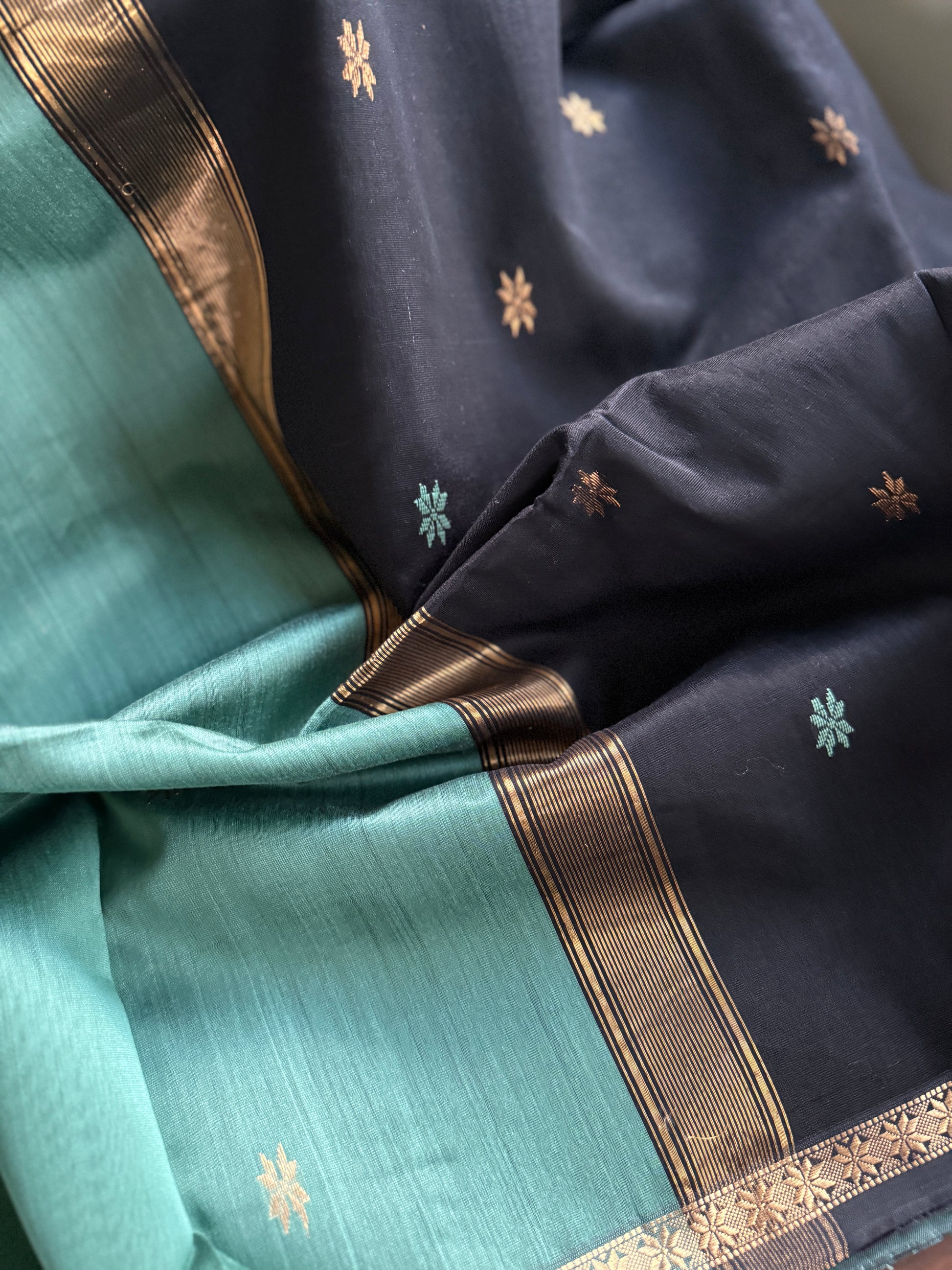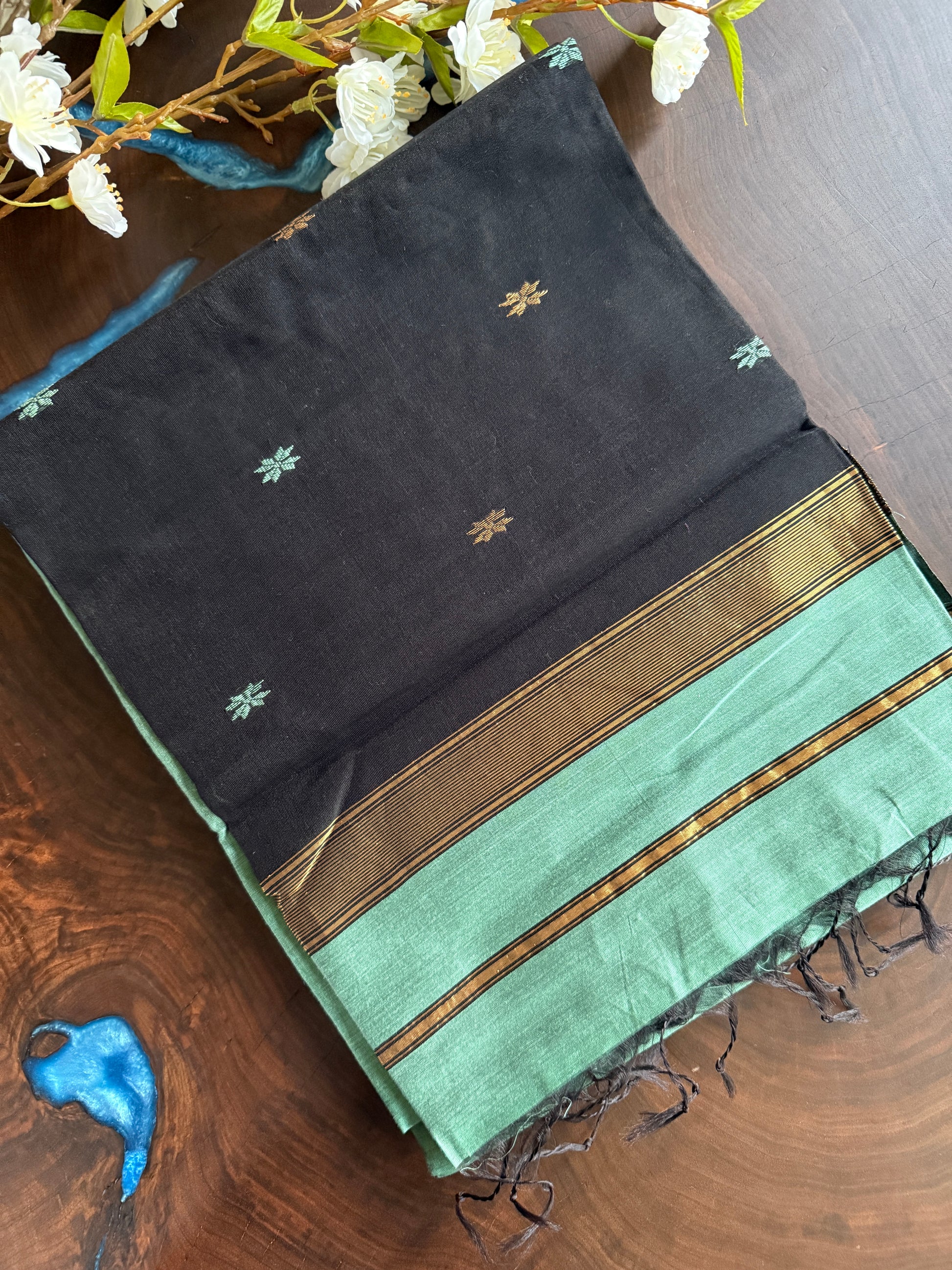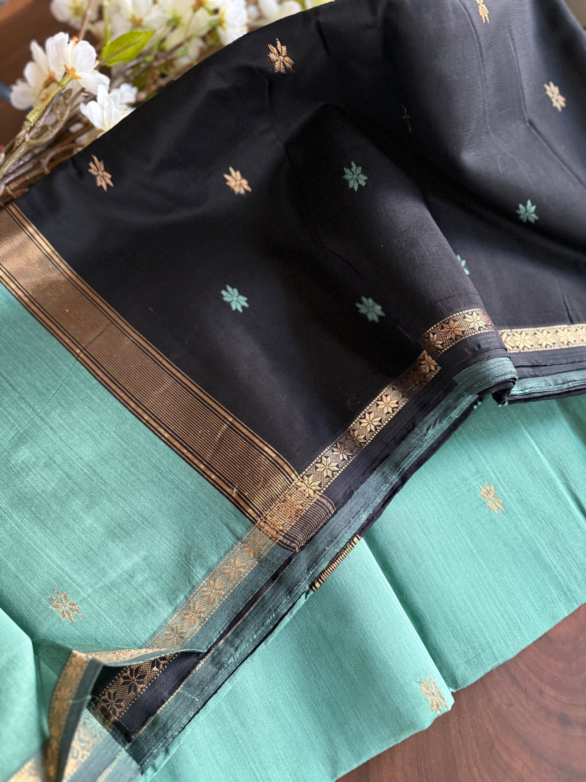 Sage Green Maheshwari comes with a black Pallu swipe to check for and Pallu and blouse pic.